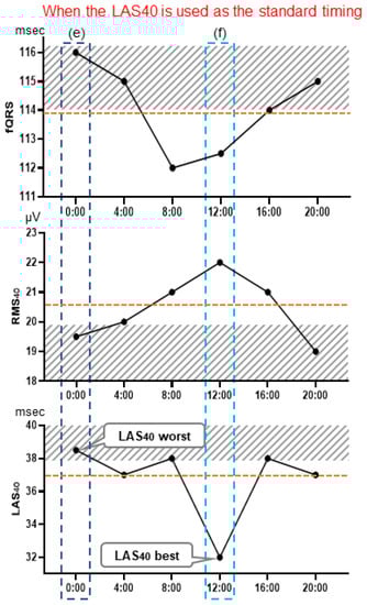 There have also been no comparative studies of optimal LP measurements according to the time of day. In general, the times of the worst fQRS, RMS40, and LAS40 readings often coincide; however, this is not always the case. The determination that the optimal timing for Holter-based LP measurement was when LAS40 was at its worst point was a novel finding. Although the LP is an automatic measurement for some electrocardiography models, others require manual editing for Holter-based LP measurements, in which case, fQRS and RMS40 measurements can be influenced by the manual editing of the onset and offset settings at the time of the LP measurement, and this may cause bias among examiners. However, the LAS40 assessment was not affected by the manual editing of the onset or offset settings. Therefore, using LAS40 to measure LP could help avoid bias among examiners.