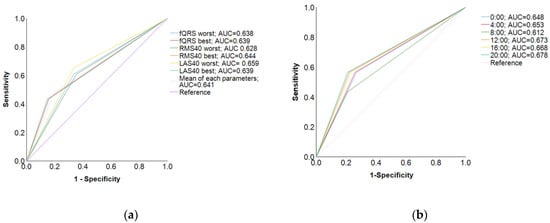 Receiver operating characteristic curves. (a) In the ROC curve for each parameter, when the LP parameter value was at the point with the worst LAS40, the AUC was higher (AUC = 0.659) and the test accuracy was lower; (b) in contrast, in the ROC curve for each time period, when the LP parameter value was at the 20:00 time point, the AUC was the highest (AUC = 0.678), and the test was highly accurate.