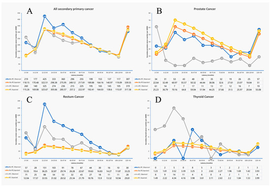 For thyroid SPM, the RT group had a significantly higher SPM than the no RT group mainly in the first 3 years after rectal cancer (2–35-month latency) (Figure 2D).