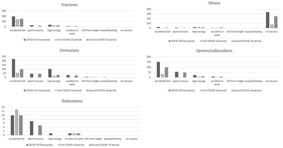 The distribution of injuries in the three periods according to the five diagnostic groups are reported in Figure 1. A significant difference was found between the COVID-free period and the first COVID period (p < 0.01) and between the first and second COVID periods (p < 0.02) according to all diagnostic groups.