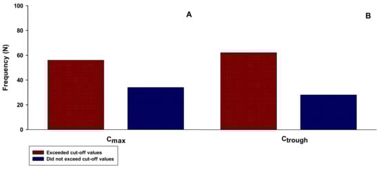 According to the Cmax, there were 34 (37.8%), and according to the Ctrough, there were 28 (31.1%) patients with plasma drug concentrations exceeding the proposed cut-off values (Scheme 1). The median time since the last therapy intake was 17 (18–24) h.