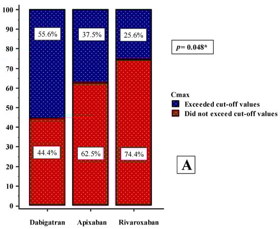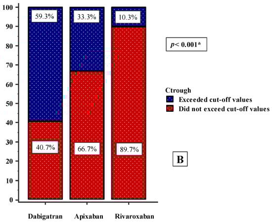 Comparison of the frequency (%) of patients with excess plasma drug concentrations between dabigatran (N = 27), apixaban (N = 24) and rivaroxaban (N = 39) according to the (A) Cmax and (B) Ctrough measurements. * chi-square test.