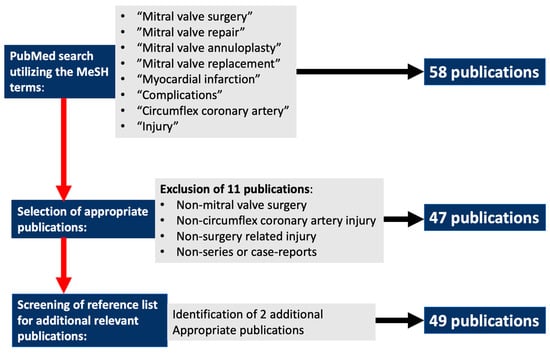 Myocardial infarction secondary to circumflex coronary artery (CX) distortion or occlusion during mitral valve (MV) surgery is associated with devastating postoperative morbidity and mortality outcomes [1,2,3,4,5,6,7,8,9,10,11,12,13,14,15,16,17,18,19,20,21,22,23,24,25,26,27,28,29,30,31,32,33,34,35,36,37,38,39,40,41,42,43,44,45,46,47,48,49]. Despite significant improvements in preoperative risk identification [50,51,52,53,54,55,56,57,58,59,60], surgical techniques [61,62,63,64,65] and surgical awareness, CX injury during MV surgery remains a dreaded complication with no current consensus on preventative and therapeutic strategies. This manuscript provides a systematic review of all available reports on CX injury during isolated MV surgery and describes current CX injury prevention and diagnosis and treatment strategies. Less invasive MV surgical approaches that utilize special single shafted instruments under direct, endoscopic or robotic vision [66] require additional instrument manipulation skills [67,68,69] and a thorough understanding of the CX, coronary sinus (CS) and MV surgical anatomy to avoid CX injury during the initial learning curves. Furthermore, reports on the potential incidence and risk of CX injury related to advances in innovative transcatheter MV repair [70,71] and replacement [72,73] technology are also emerging. By utilizing the MeSH terms “mitral valve surgery”, “mitral valve repair”, “mitral valve annuloplasty”, “mitral valve replacement”, “circumflex coronary artery injury”, “complications”, “myocardial infarction” in various combinations, a total of 89 patients who sustained CX injury secondary to MV surgery was identified from 49 PubMed reports between 1967 and 2022 (Table 1). Between 2011 and 2022, a total of 29 reports described 60 CX injury events during MV surgery. A flowchart that outlines the PubMed and PRISMA search methodology is presented in Figure 1.