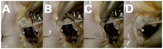 The rapid development, favorable outcomes and simplification of durable MV repair techniques as described by Carpentier [62,63,64] redefined the modern role of MV replacement [61]. The reported decrease in MV replacement procedures performed in developed countries [78] parallels modern international guidelines [74,75] that strongly advocate MV repair whenever possible. Various reports describe CX injury during MV repair [6,8,9,10,11,12,13,14,15,16,17,18,19,20,21,22,23,26,27,29,30,31,32,33,34,35,38,39,41,42,44,46,48,49] and emphasize the importance of accurate and meticulous annuloplasty needle entry angle, direction, depth, instrument manipulation and exteriorization in areas where the CX–CS–MV complex is at risk. Wide posterior leaflet quadrangular resection, extensive posterior sliding plasty and the use of excessively small or large annuloplasty rings should be avoided to minimize the risk of tissue traction, distortion or external compression of the CX in high-risk areas [79,80,81,82,83]. Caruso and colleagues [59] utilized flexible annuloplasty rings in high-risk CX–CS–MV-complex patients, which accounted for 50% of their series. Annular sutures between the anterolateral commissure and P1 were omitted in 58% of these patients. Chauvette and colleagues [83] strongly advocate anterolateral trigone stabilization to prevent partial annuloplasty as a fundamental principle of safe and durable MV repair, emphasized that the fear of CX injury should not result in inadequate MV repair and reiterated the importance of rigid rings within the context of ischemic MV disease. In addition to mechanical CX injury, Obarski and colleagues [84] suggested that water-testing of valve competence following MV repair may potentially result in air embolism and transient CX ischemia, which may resolve or evolve to infarction. Minimally invasive and robotic approaches are becoming increasingly established as excellent surgical alternatives to conventional MV surgery by sternotomy access [66]. However, the learning curves associated with establishing less invasive surgical programs are well reported [67,68,69] and require additional skills in single-shaft and robotic console instrument manipulation. CX injury during less invasive MV procedures is described [13,18,20,26,28,31,41,42,44,46]. The technical aspects of endoscopic posterior annular suture placement are outlined in Figure 4 and can be mastered in innovative simulation environments [85]. Everting and non-everting annular sutures should not be placed more than 3 mm from the posterior annulus in MV replacement. Extensive posterior annular resections and reconstructions required in severe MV annular calcification [86] and destructive infective endocarditis [87] should be performed with CX injury awareness. Innovative TC–MV technology currently includes various annuloplasty devices that use anchors or sutures for annular implantation through the left atrium or CS [70,71] and replacement technology [72,73] that are implanted through peripheral or trans-apical access. A meta-analysis by Kargoli and colleagues [72] recently reported that no CX injury secondary to TC mitral valve devices was described or observed to be up to date. Effectiveness and durability are the main concerns of TC approaches, and outcome reports are progressively emerging with exciting prospects for future treatment of MV disease.