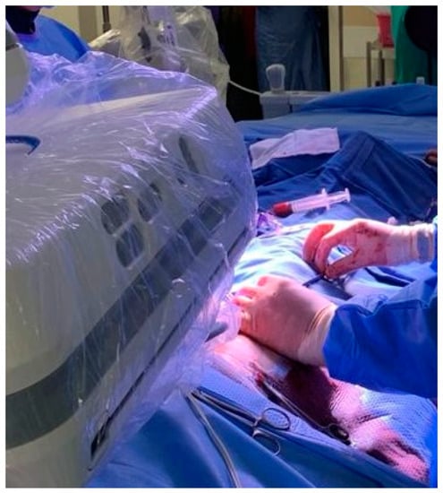 The intraoperative diagnosis of CX injury is currently documented in 20 reports of 34 patients [6,10,11,13,14,16,17,18,19,20,22,28,31,35,39,40,41,42,45,46] and suggests that only 48.3% of all documented CX injuries during MV surgery are diagnosed intraoperatively. Once suspected, urgent confirmation of CX injury and the rapid identification of the responsible mechanism by TEE and/or coronary angiography are crucial to expedite the appropriate treatment strategy [10,11,12,13,14,15,16,17,18,19,20,21,22,23,24,25,26,27,28,29,30,31,32,33,34,35,36,37,38,39,40,41,42,43,44,45,46,47,48,49]. Flow-limiting CX injuries diagnosed intraoperatively require emergency revascularization and restoration of distal perfusion by either emergency empiric coronary artery bypass grafting (CABG) of the obtuse marginal branches utilizing saphenous vein [6,10,14,15,19,27,31,37,38,48], by revising the prosthesis sutures [6,7,17,20,22,30,32,36,38,42,48] or by PCI [8,9,11,12,13,16,18,20,21,22,23,24,26,28,29,31,32,33,34,35,37,38,39,40,41,42,43,44,45,46,47,48,49]. CABG should strongly be considered in an unstable intraoperative setting, where transfer to the catheterization laboratory is prohibited or delayed and where TEE or angiography confirm total CX occlusion [48], especially if sternotomy access is utilized. Revision of annuloplasty sutures in isolation or in combination with either CABG or PCI is documented in 14 reports and can be considered in minimally invasive MV surgery where conversion to sternotomy is not possible or desirable, or where emergency CABG may be challenging [13,18,20,26,28,31,41,44]. Various authors elected to transfer confirmed CX injuries directly from the operating room (n = 21) or from a postoperative intensive care setting (n = 18) for coronary angiography and PCI after Mantilla and colleagues [8] reported the first PCI for a partially occluded CX injury in 2004. Revascularization by PCI is feasible and preferred in a stable intraoperative setting where CX injury is confirmed to be the result of a partial CX occlusion and where transfer and ischemic reperfusion times are minimal. The inability to cross totally occluded CX injuries with guidewires, stent under-expansion and potential CX rupture are amongst the immediate risks reported with PCI [43,48,49]. The recent advances in hybrid theatre technology, which facilitate combined single-stage surgical MV and TC interventions [65], may decrease CX ischemic reperfusion time by providing the option of rapid on-table coronary angiography and attempts at PCI as an alternative to CABG once the clinical suspicion and mechanism of CX injury is confirmed by TEE (Figure 5).