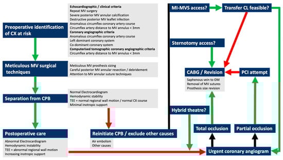 Comprehensive CX injury prevention, diagnosis and treatment algorithm. Abbreviations: CX: circumflex coronary artery; MV: mitral valve; CPB: cardiopulmonary bypass; TEE: transesophageal echocardiography; CL: catheterization laboratory; CABG: coronary artery bypass grafting; PCI: percutaneous coronary intervention. MI-MVS: minimally invasive mitral valve surgery.