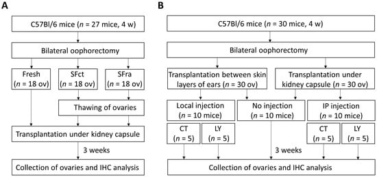 Experimental design for the mice model used to investigate the effects of adding rapamycin to the freezing medium on follicle activation and proliferation (A) as well as the comparison between two ovarian transplantation sites, namely, between the skin layers of the ears and under the kidney capsule (B). 4 w = 4 weeks old, Fresh = ovaries transplanted directly after oophorectomy, SFct = slow-freezing in control medium, SFra = slow-freezing with rapamycin, IHC = immunohistochemistry, IP = intraperitoneal, CT = control injection, LY = injection with LY294002.