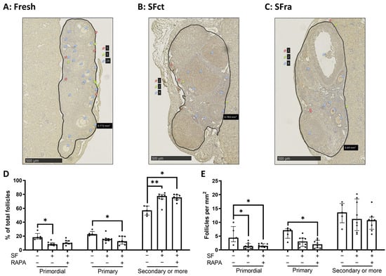 Designated ovaries were SF and thawed as described before []. Briefly, whole ovaries were put in a freezing solution containing Leibovitz L-15 medium supplemented with 10% FBS, 10% dimethylsulfoxide (DMSO; Merck, Darmstadt, Germany), and 0.1 M sucrose, and equilibrated for 30 min at 4 °C. After equilibration, ovaries were put in cryovial tubes (Simport, Montreal, QC, Canada) containing freezing solution and thereafter SF in a programmable freezing machine (CL-8800i System; CryoLogic, Mulgrave, Victoria, Australia) as previously described and stored in liquid nitrogen []. For ovaries SF with rapamycin (1 μM, InvivoGen, Toulouse, France), the inhibitor was added to the transport and freezing solutions. Thawing was performed by incubating cryovials for 2 min at room temperature (RT) followed by a 2 min incubation at 37 °C in a water bath. Ovaries were then washed in Leibovitz L-15 medium 3 times for 5 min at 37 °C to remove any remaining cryoprotectants and/or rapamycin.