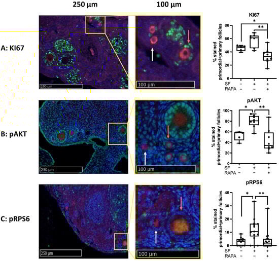 Effects of adding rapamycin to the freezing medium on follicle activation and proliferation in fresh, SFct, or SFra mice ovaries autotransplanted under the kidney capsule of C57BL/6 mice (4 weeks old) for three weeks. Immunohistochemistry (IHC)-assisted quantification (median + min to max) of the percentage of primordial and primary follicles labeled for KI67 (A), pAKT (B), and pRPS6 (C), including representative images of ovaries in the fresh group. Red staining = DDX4, green staining = KI67, pAKT, or pRPS6. White arrow = non-green-stained follicle, orange arrow = green-stained follicle. * p ≤ 0.05, ** p ≤ 0.01. SF = slow-frozen/thawed ovaries, RAPA = rapamycin. (A,B) n = 5–8 ovaries per group, (C) n = 12–17 ovaries per group.