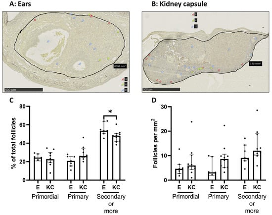 Comparison of follicle densities between fresh mice ovaries autotransplanted either between the skin layers of the ear or under the kidney capsule of C57BL/6 mice (4 weeks old). Representative images of LHX8 staining of fresh mice ovaries transplanted either between the skin layers of the ears (A) or under the kidney capsule (B). Red pins indicate primordial follicles, yellow pins primary follicles, and blue pins secondary or more growing follicles. Follicle density was either expressed in the percentage of primordial, primary, and secondary or more growing follicles relevant to the total amount per section (C) or as the total number of each follicle type per mm2 (D) (median with interquartile range). n = 7–10 ovaries per group. * p ≤ 0.05. E = transplantation of ovaries between skin layers of ears, KC = transplantation of ovaries under the kidney capsule.