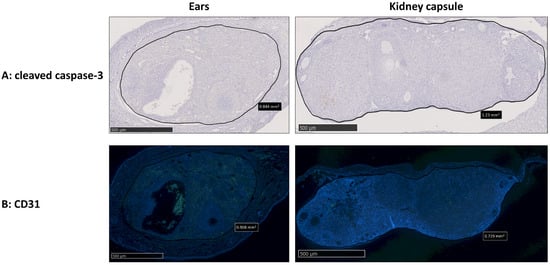 Many different ovarian transplantation sites have been investigated to test pharmacological strategies, with every site having its advantages [,,,,,,,,]. Our team previously evaluated an alternative heterotopic transplantation site for ovarian grafts between the skin layer and cartilage of the ears, adapted from the ear sponge assay that was set up to study (lymph) angiogenesis [,]. This site was chosen as the transplantation procedure is less invasive compared to more conventional models. Additionally, the ears are highly vascularized, being of great importance as major follicle “burn out” has been reported due to ischemia [,,]. Our second aim was to compare this new model to the more conventional kidney capsule transplantation site.