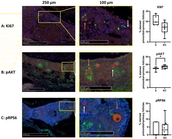 Comparison of follicle activation and proliferation between fresh mice ovaries autotransplanted either between the skin layers of the ear or under the kidney capsule of C57BL/6 mice (4 weeks old). IHC-assisted quantification (median + min to max) of the percentage of primordial and primary follicles labeled for KI67 (A), pAKT (B), and pRPS6 (C), including representative images of ovaries transplanted under the kidney capsule. Red staining = DDX4, green staining = KI67, pAKT or pRPS6. White arrow = non-green-stained follicle, orange arrow = green-stained follicle. * p ≤ 0.05. n = 5–10 ovaries per group. E = transplantation of ovaries between skin layers of ears, KC = transplantation of ovaries under the kidney capsule.