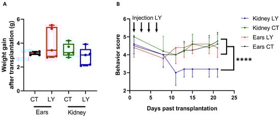 Effect of LY294002 (LY) injection on weight gain and mice behavior after ovarian autotransplantation into C57BL/6 mice (4 weeks old). Ears were injected locally and the kidney capsule was injected intraperitoneally. Weight gain (in grams; median + min to max) (A) and behavior score (0 = least active, 5 = most active; mean ± SEM) (B) of treated or control mice monitored for three weeks after transplantation. n = 4–5 mice per group. **** p ≤ 0.0001. CT = vehicle control, LY = LY294002.