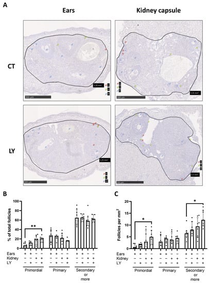Comparison of follicle densities for LY injection after ovarian autotransplantation into C57BL/6 mice (4 weeks old) either locally in the ears or intraperitoneally (IP) when ovaries were transplanted under the kidney capsule. (A) Representative images of LHX8 staining of fresh mice ovaries transplanted either between the skin layers of the ears or under the kidney capsule, followed by local injection with LY or vehicle control for ovaries transplanted between skin layers of the ears, or IP for ovaries transplanted under the kidney capsule. Red pins indicate primordial follicles, yellow pins primary follicles, and blue pins secondary or more growing follicles. Follicle density was either expressed in the percentage of primordial, primary, and secondary or more growing follicles relevant to the total amount per section (B) or as the total number of each follicle type per mm2 (C) (median with interquartile range). n = 7–8 ovaries per group. * p ≤ 0.05, ** p ≤ 0.01. CT = control injection, LY = injection with LY.
