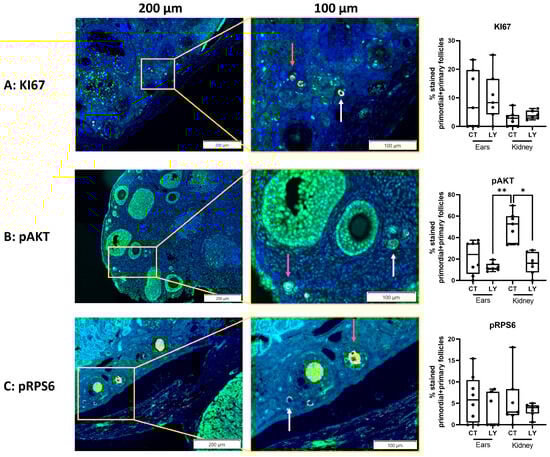 Comparison of follicle activation and proliferation for LY injection after ovarian autotransplantation into C57BL/6 mice (4 weeks old). Ears were injected locally and the kidney capsule was injected intraperitoneally. IHC-assisted quantification (median + min to max) of the percentage of primordial and primary follicles labeled for KI67 (A), pAKT (B), and pRPS6 (C), including representative images of ovaries transplanted under the kidney capsule followed by control IP injection. Yellow staining = DDX4, green staining = KI67, pAKT, or pRPS6. White arrow = non-green-stained follicle, orange arrow = green-stained follicle. * p ≤ 0.05, ** p ≤ 0.01. n = 6–8 ovaries per group. CT = vehicle control, LY = LY294002.