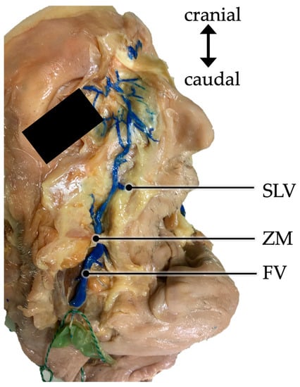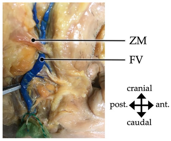 Molinari et al. [] examined the course of the facial vein and found that it runs in front of the masseter muscle and can also cross its foremost muscle fibers in order to run further caudally on its surface.