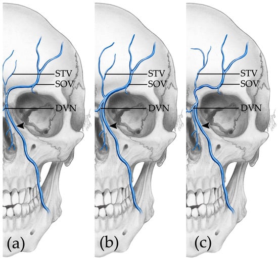 Figure 4. Types of drainage of the supraorbital and supratrochlear veins. (a) Type A: Drainage into the angular vein at or above the level of the dorsal vein of the nose. (b) Type B: Drainage into the angular vein below the level of the dorsal vein of the nose. (c) Type C: Drainage into the supratrochlear vein. ➤—angular vein; STV—supratrochlear vein; SOV—supraorbital vein; DVN—dorsal vein of the nose. - Type B: Drainage into the angular vein below the level of the dorsal vein of the nose (Figure 4b);