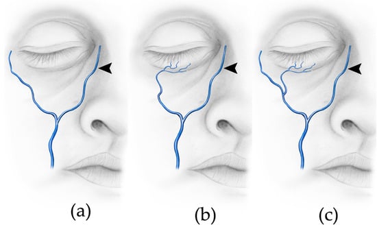 - Shimizu, Y.; Imanishi, N.; Nakajima, T.; Nakajima, H.; Aiso, S.; Kishi, K. Venous Architecture of the Glabellar to the Forehead Region. Clin. Anat. 2013, 26, 183–195. [Google Scholar] [CrossRef]