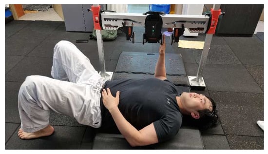 This was a cross-sectional, single-blind study. We recruited 48 BJJ athletes from 5 teams in Seoul and Kyeonggi, Republic of Korea. The inclusion criteria were more than 1-year BJJ-trained males or female athletes between 20 and 50 years of age, with at least one official BJJ competition participation. The exclusion criteria were acute injury within 1 month or a history of upper body orthopedic surgery. The sample size was calculated using G Power software version 3.1 (University of Kiel, Kiel, Germany). With an effect size of 0.8 from the previous study [], a significance level of 0.05, and a power of 0.95, we required a sample size of 30. Fifty-one BJJ athletes were recruited for this study, and three were excluded because of acute injuries at the time of measurement. Written informed consent was obtained from all participants prior to measurements. The Ethical review board of CHA University approved this study (1044308-202209-HR-048-02).