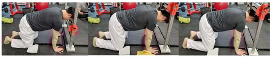 ForceFrame (VALS, Brisbane, Australia) was used to measure the isometric neck strength. The participants were asked to be in a quadruped position with their head on ForceFrame. The frames were adjusted for each participant. Flexion, extension, and left and right lateral flexions were measured (Figure 2). After two-time practice sessions at 50% strength, two full isometric strength measurements were performed with a 10 s break between measurements. The average of the two measurements for each move was recorded. The reliability of this method was reported to be high (ICC = 0.92–0.97) [].