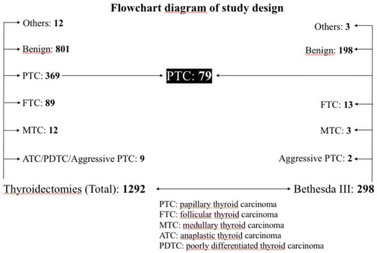 Flowchart diagram of study design. The patients included in the study were recruited, after applying the previously established exclusion criteria, from the total number of PTCs that came from the Bethesda III diagnostic category. Exclusion criteria: FTC—follicular thyroid carcinoma. MTC—medullary thyroid carcinoma. ATC—anaplastic thyroid carcinoma. PDTC—poorly differentiated thyroid carcinoma. Aggressive PTC—Papillary Thyroid Carcinoma other than classical, follicular or incapsulated variant. Others: BIII + indeterminate/suspected/malignant nodule; nodule in Grave’s Disease; neck irradiation.