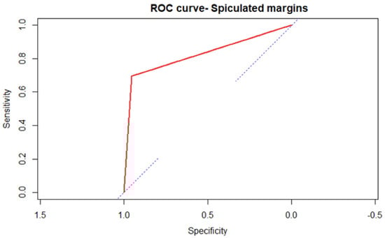 The diagnostic performance of spiculated margins is evidenced by the area under curve, which is visually quite large. Note that the square shape of the ROC curve is a consequence of the analysis performed on a parametric variable.
