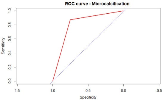 Regarding the variable “microcalcifications” the same indications as the previous one can be applied. The shape of the area under the curve demonstrates, compared with the previous one, a shift in favor of sensitivity.