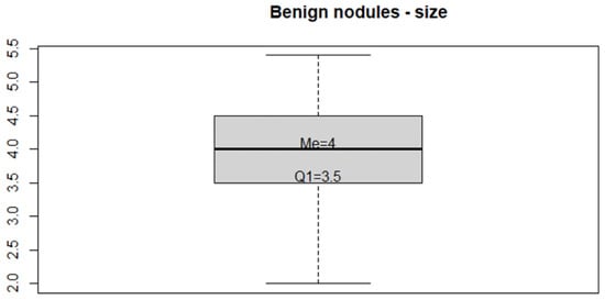 Figure 4 shows the box plot regarding the size distribution of benign nodules undergoing ultrasound for “critical review” purposes. The graph shows that the median size of the distributions of the 186 benign nodules is 4 cm; while the first quartile turns out to be 3.5 cm; therefore, the possible cut off below which surgery should not be performed could be identified between the values 3.5 cm–4 cm, which is in agreement with the literature data and the main available guidelines []. In agreement with our data, surgery performed according to the correct guidelines falls in the range (219–137 = 82 + 79 malignant) = 161; (161/298) = 54% and (219–85 = 134 + 79 malignant) = 213 (213/298) = 71.5%).