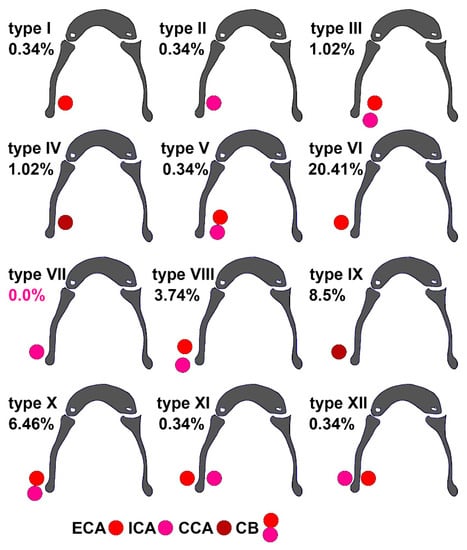 - Al-Rafiah, A.; AA, E.L.-H.; Aal, I.H.; Zaki, A.I. Anatomical study of the carotid bifurcation and origin variations of the ascending pharyngeal and superior thyroid arteries. Folia Morphol. 2011, 70, 47–55. [Google Scholar]