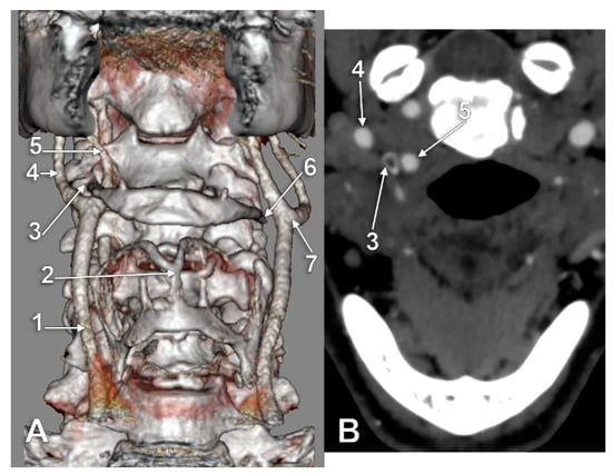 - Ferracci, F.X.; Heuze, D.; Sacco, R.; Curado, J.; Monnot, A.; Duparc, F.; Ould-Slimane, M. Common carotid artery medialization and fracture dislocation of the cervical spine. Surg. Radiol. Anat. 2022, 44, 1073–1077. [Google Scholar] [CrossRef] [PubMed]