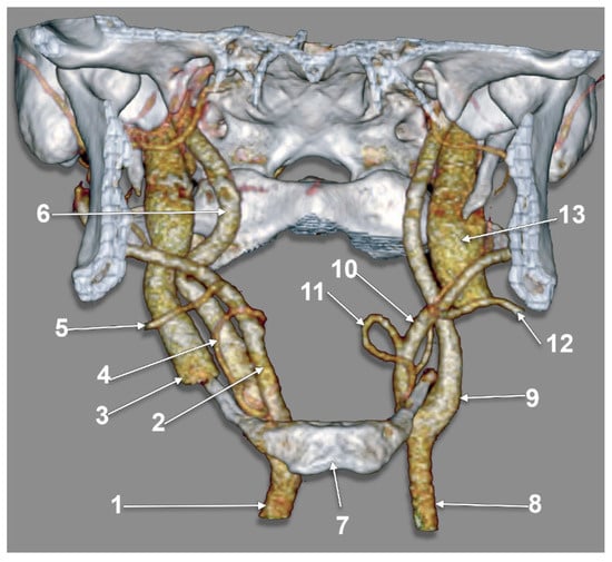 - Zumre, O.; Salbacak, A.; Cicekcibasi, A.E.; Tuncer, I.; Seker, M. Investigation of the bifurcation level of the common carotid artery and variations of the branches of the external carotid artery in human fetuses. Ann. Anat. 2005, 187, 361–369. [Google Scholar] [CrossRef] [PubMed]