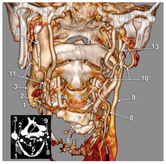 - Nayak, S.; Kumar, N. Multiple Loops of External and Internal Carotid Arteries Vulnerable in Surgical and Radiological Procedures. Balk. Med. J. 2018, 35, 285–286. [Google Scholar] [CrossRef]