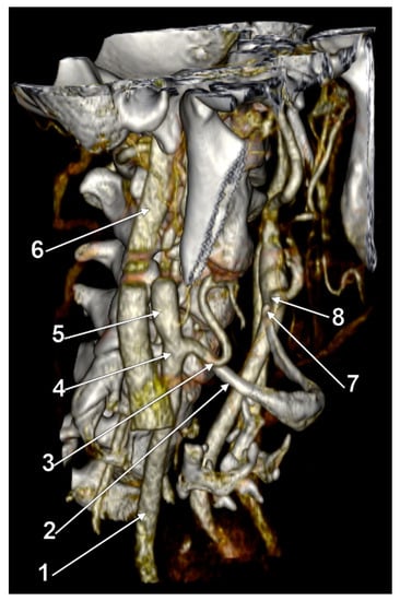 - Rusu, M.C.; Jianu, A.M.; Manta, B.A.; Hostiuc, S. Aortic Origins of the Celiac Trunk and Superior Mesenteric Artery. Diagnostics 2021, 11, 1111. [Google Scholar] [CrossRef]