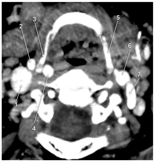 - Lukins, D.E.; Pilati, S.; Escott, E.J. The Moving Carotid Artery: A Retrospective Review of the Retropharyngeal Carotid Artery and the Incidence of Positional Changes on Serial Studies. AJNR Am. J. Neuroradiol. 2016, 37, 336–341. [Google Scholar] [CrossRef]