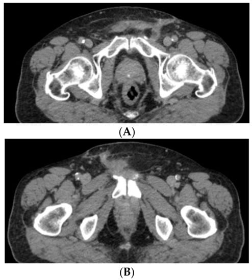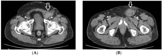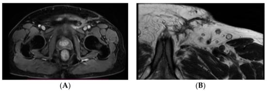 About one and a half months after the second surgical procedure, pelvic Magnetic Resonance Imaging (MRI) is performed (Figure 4A,B), revealing a recent postoperative aspect in the left inguinal and femoral area, with associated inflammatory modifications. In addition, it reveals external iliac lymph nodes of a maximum 21/7 mm size on the right side and 19/6 mm on the left side, and inguinofemoral lymph nodes of a maximum of 13/8 mm in size on the right side and 13/9 mm on the left side. In addition, the pectineal muscle presents in its 1/3 anterior region a few muscle bundles with modified signal (short tau inversion recovery (STIR) hypersignal), gadolinium enhancement—inflammatory modifications or tumor invasion, as well as a few satellite lymph nodes of maximum 7/6 mm in size.