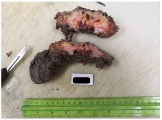 In contrast to the spindle cell rhabdomyosarcoma in children and adolescents, where the most commonly affected region is the genitourinary tract and the orbital area, the main location of the spindle cell rhabdomyosarcoma in adults is in the head and neck region (except the orbital area) and the deep soft tissue of the extremities [,,,]. In addition, although they have a better prognosis compared to other subtypes of rhabdomyosarcoma, spindle cell rhabdomyosarcoma tumors are very aggressive and associated with a poor prognosis in adults, compared to this subtype of tumors in children [,].