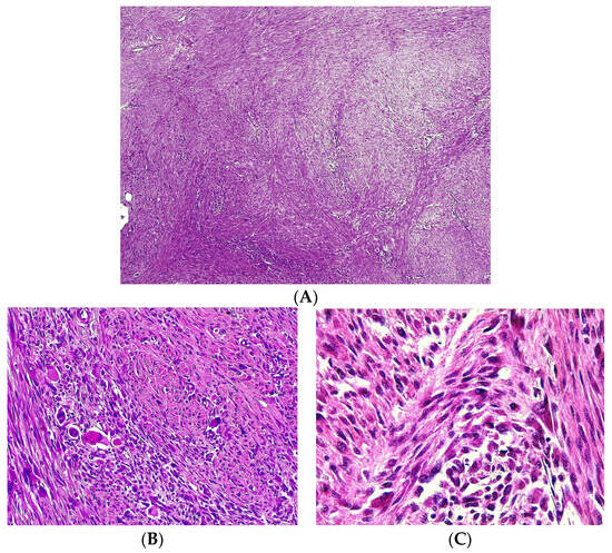 Cavazzana et al. first described spindle cell rhabdomyosarcomas in children [], while Rubin et al. published the first occurrence of spindle cell rhabdomyosarcomas in adults []. Furthermore, Mentzel et al. reported sclerosing pseudovascular rhabdomyosarcoma, an additional morphological variant of spindle cell rhabdomyosarcoma, in adults []. Although initial classifications included the spindle cell/sclerosing rhabdomyosarcoma as a subtype of embryonal rhabdomyosarcoma [], it was classified as a separate entity by the World Health Organization in 2013 []. Morphologically, it consists of fusiform cells with vesicular chromatin arranged in a storiform pattern or long fascicles, with occasional rhabdomyoblasts. Also, dense, collagenous, sclerotic stroma may be seen more commonly in adults [].