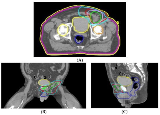 Sections of external radiation areas: clinical target volume (CTV) 1—red (50 Gy); PTV1—dark blue (50 Gy); CTV2—green (66 Gy); PTV2—purple (66 Gy); axial (A), coronal (B) and sagittal (C) sections. Sky blue, pink, yellow and orange have no clinical significance in this case.