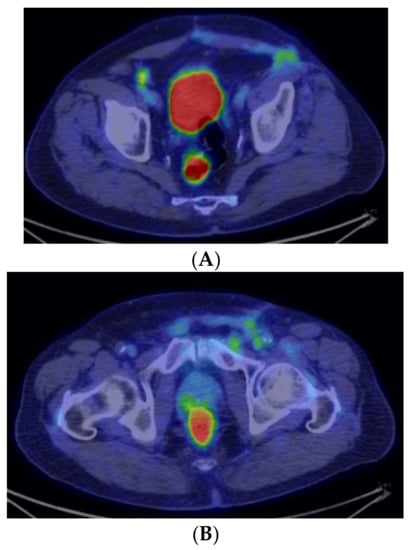 Postoperative PET-CT aspect, at different levels—axial sections (A,B).