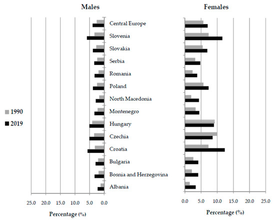The proportion (%) of new cases of hip fracture due to falls (of all new cases of hip fracture) in the Central European region, by country and sex, in 1990 and 2019 [26].