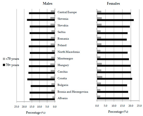 The proportion (%) of new cases of hip fracture due to falls (of all new cases of hip fracture) in the Central European region, by country, sex, and age, in 2019 [26].
