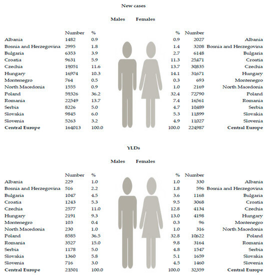 Numbers of new cases and Years Lived with Disability (YLDs) of hip fracture due to falls in the Central European region, by country and sex, in 2019 [26].