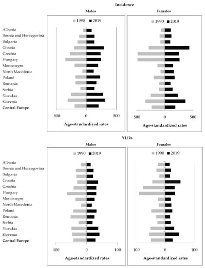 Incidence and Years Lived with Disability (YLDs) of hip fracture due to falls in the Central European region, by country and sex, in 1990 and 2019. Age-standardized rates per 100,000 [26].