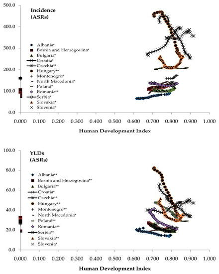 Correlation of the age-standardized rates (per 100,000) in incidence and Years Lived with Disability (YLDs) of hip fracture due to falls in the Central European region with Human Development Index, by country, during 1990–2019.* Statistically significant positive correlation; ** statistically significant negative correlation; # absence of correlation [23,28].