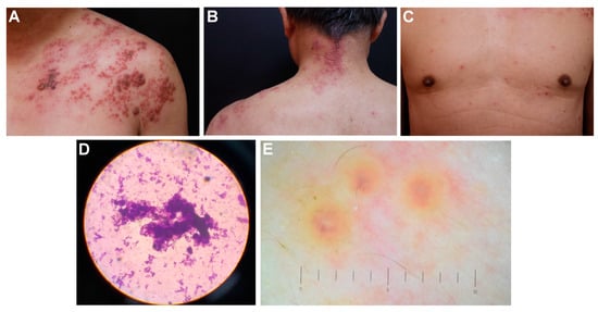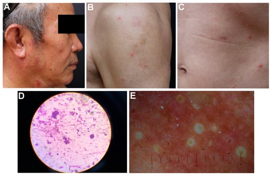 - Zhang, L.W.; Fu, L.X.; Meng, H.M.; Lu, Y.H.; Chen, T. Disseminated herpes zoster following inactivated SARS-CoV-2 vaccine in a healthy old man. Eur. J. Dermatol. 2022, 32, 415–416. [Google Scholar] [CrossRef]