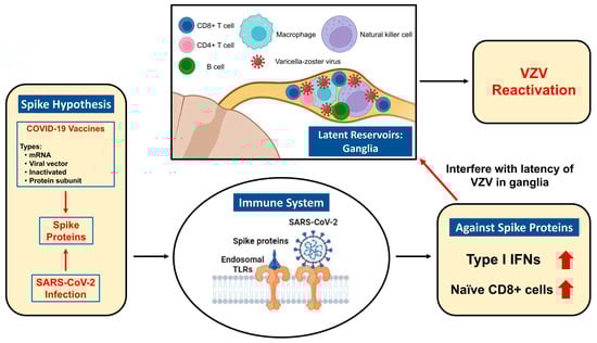 - Yamamoto, M.; Kase, M.; Sano, H.; Kamijima, R.; Sano, S. Persistent varicella zoster virus infection following mRNA COVID-19 vaccination was associated with the presence of encoded spike protein in the lesion. J. Cutan. Immunol. Allergy 2023, 6, 18–23. [Google Scholar] [CrossRef]
