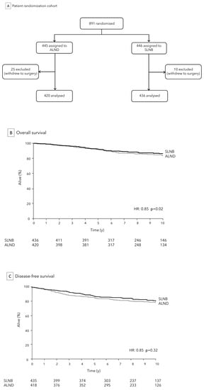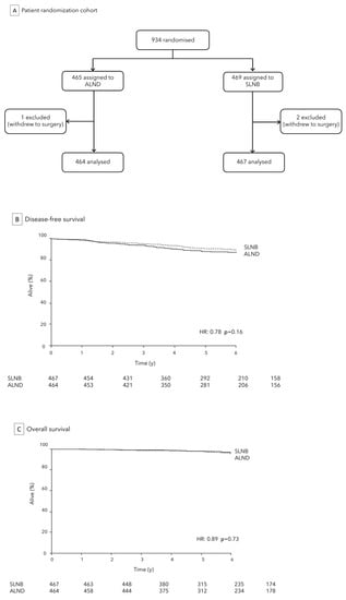 ALND is not justified for patients with micrometastatic sentinel node involvement, and this does not impact on survival, as deduced by wide clinical trials [7]. A multicenter phase III trial (IBCSG 23-01) was published in 2013 in which 934 women with cT1 or cT2 tumors and micrometastatic disease (≤2 mm) in ≥1 SLN who underwent lumpectomy or mastectomy were randomized to receive ALND versus SLNB. Figure 2A After a median follow-up of over 5 years, no significant differences were observed in terms of axillary recurrence (1% in the observation group vs. <1% in the ALND group), and DFS (87.8% in the observation group vs. 84.4% in the ALND group, p = 0.16) between the two cohorts. Figure 2B,C However, the ALND group experienced significantly higher rates by about three times of severe complications, including sensory neuropathy (18% vs. 12%, p = 0.012), lymphedema (13% vs. 3%, p < 0.0001), and motor neuropathy (8% vs. 3%, p = 0.0004) [23]. Findings after a median follow-up of 9.7 years (IQR 7·8–12.7) consolidate those obtained at 5 years and are consistent with Z0011 trial analysis [19]. Conclusively, all these findings have supported the omission of ALND in cN0 early BC patients, irrespective of the type of breast surgery given (mastectomy or breast conserving surgery), in relation to a non-inferiority of observation approach versus ALND treatment, both in terms of DFS and regional recurrences, with potential reduction of morbidity. This demonstrates a clear trend of clinical research towards minimizing axillary surgery, even in the presence of SLN involvement. Opting for a therapeutic path that avoids ALND not only fosters a swifter post-operative recovery but also enhances the overall well-being of the patient, ensuring a quicker return to normal daily, work, and social. This consideration is pivotal in making the decision to embrace the optimal approach for each patient, considering the specific benefits and risks associated with the surgical approach.