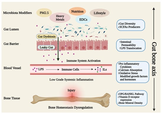 An illustration of the gut–bone axis that highlights the causes and processes starting with gut dysbiosis, leading to dysregulation in the bone homeostasis mechanism that favors osteoclasts boosting bone resorption and encouraging the emergence of bone diseases. LPS: Lipolysaccharide; ILs: Interleukins; SCFAs: Short chain fatty acids; RANKL: Receptor activator of NF-kB ligand; OPG: Osteoprotegerin; PM: Particulate Matter; EDCs Endocrine Disrupting Chemicals.
