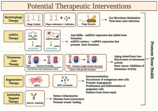 Diagram illustrates the putative mode of action of the potential therapeutic interventions that could be used for promoting bone health and treating bone disorders. IL: Interleukin; miRNA: microRNA; MSC: Mesenchymal Stem Cells.