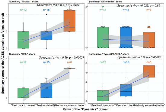 Correlation between scores of ACSS domains and “Dynamics” in patients at follow-up visit. Three “Dynamics” categories were reported at follow-up visit: 0—feel back to normal; 1—feel much better; 2—feel only somewhat better.